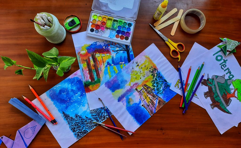 Growing up in this art frenzy family means you never run short of art supplies. Sketch pens, paints, acrylics, pencil ones and crayon ones, brushes and glues and tapes and what not. Come hither summer vacations, and the Picasso in us awakens like Prospero has conjured back some spirits of the art. And this table was the painter ( or doodler as in my case who hardly knows how to handle a brush) desk for the rest two months, creating masterpieces ( and funny-faced cartoons) to be put up on the walls. Stock full until next vacations.